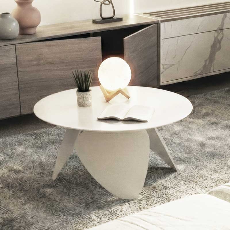 La base scultorea si compone di elementi curvi che si rincorrono, regalando una sensazione di movimento e leggerezza. Il piano rotondo, ampio ed essenziale, completa la composizione donando armonia ed eleganza a ogni ambiente.
