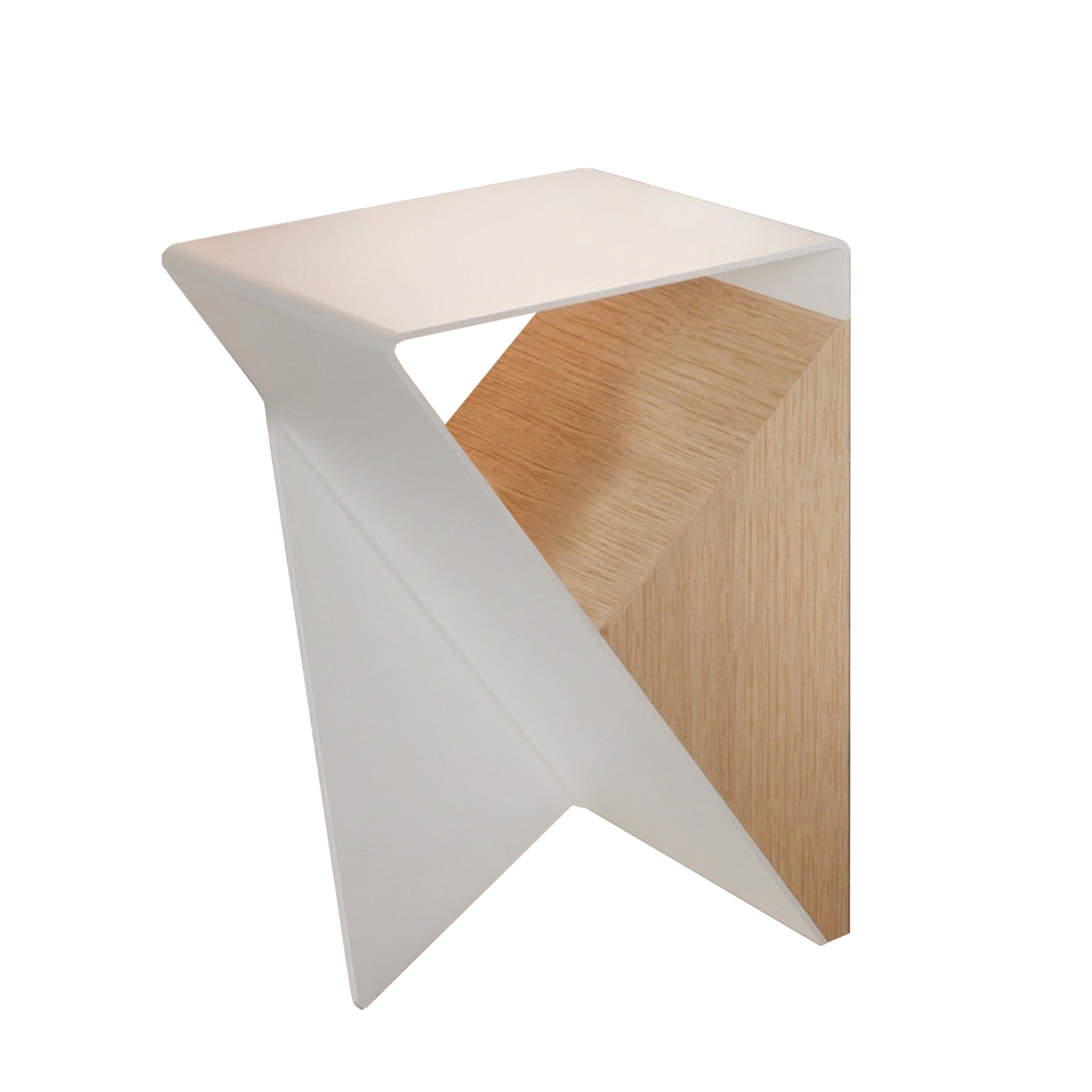 Ispirato agli origami, Svevo è realizzato in lamiera presso-piegata e arricchito da un volume geometrico irregolare in legno, che dona calore e profondità. Ogni dettaglio è pensato per coniugare pulizia formale e presenza scenica.